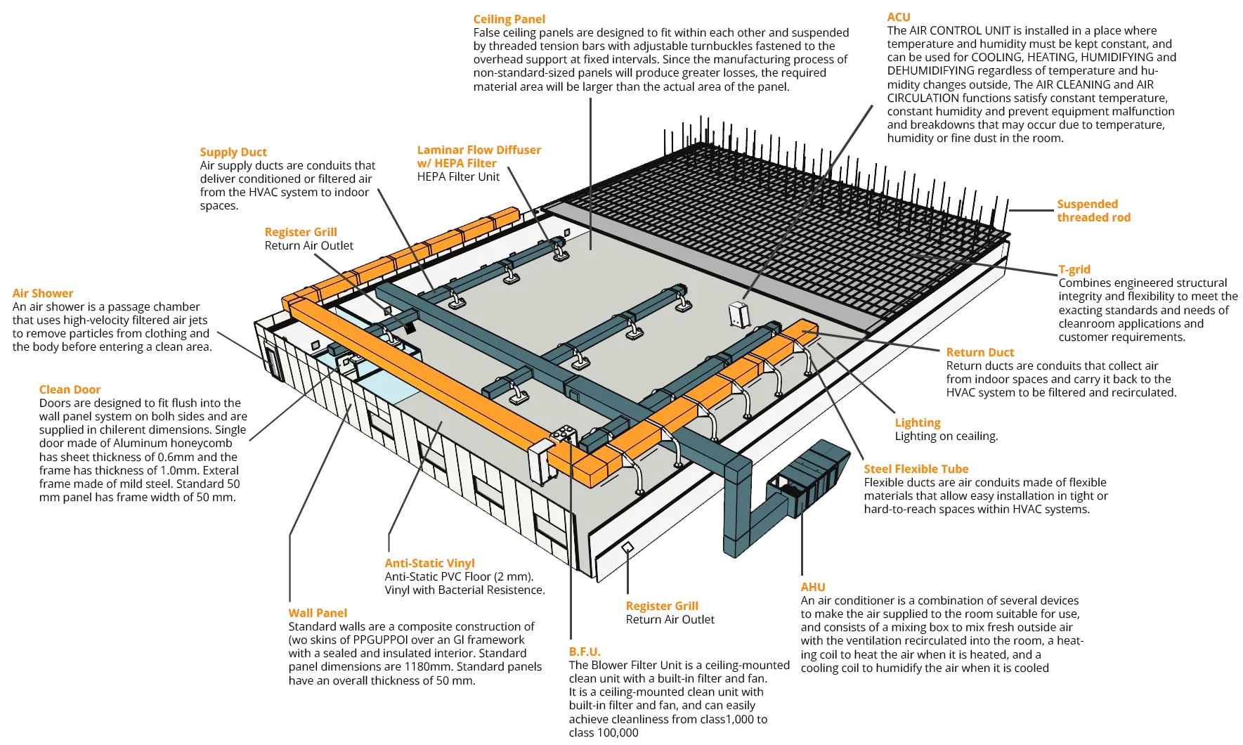 When developing these spaces, several factors come into play: the intended application, the acceptable particle concentration (ppm), the facility’s location, the type of manufacturing process, as well as cost and delivery times.